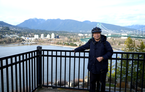 海岸線のサイクリングロードをそのまま海岸づたいに行くと、ライオンズゲート・ブリッジをしたからくぐることになります。それも迫力があるそうですが、今回は、上からブリッジを眺めるコースを選ぶことにしました。目的地は、プロスペクト展望台。